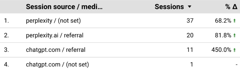 以下是如何查看人們從 AI 搜尋點擊到您網站的快照。只需轉到 GA4 中的推薦流量,然後過濾“AI”或“GPT”會話來源/媒介!